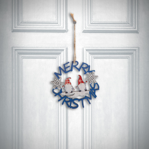 Karácsonyi dekoráció - fa, kék manó - 10 cm Ez a gyönyörű fából készült manó figurás dísz tökéletes kiegészítője lehet a karácsonyi dekorációnak otthonában. Szépen kidolgozott, aranyos manó figurák, amelyek Merry Christmas feliratban állnak, ami az ünn