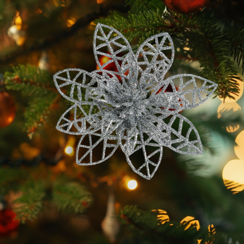 Family Karácsonyi dísz - csipeszes - glitteres virág - ezüst - 3 db / csomag
