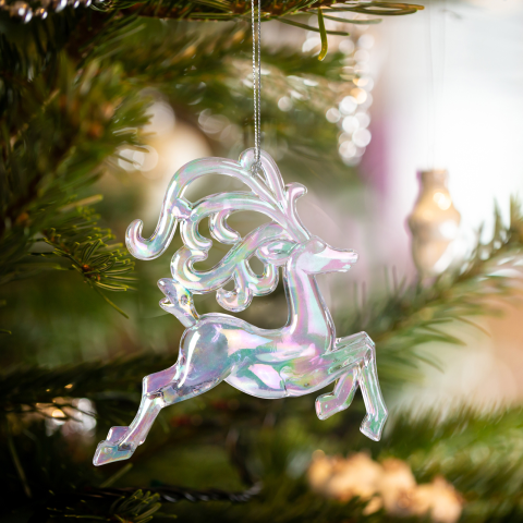 Ez a karácsonyi dísz egy különleges irizáló hatású rénszarvas, amelyek elegánsan díszíti a karácsonyifát vagy bármely más ünnepi összeállítást. Az akrilból készült dísz könnyű, mégis strapabíró, így évről-évre újra felhasználható. Az irizáló hatás miatt a dísz színei változnak az árnyékoktól és a fénytől függően, ami még varázslatosabbá teszi a karácsonyi dí