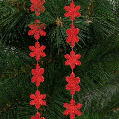 Karácsonyi girland - hópehely - 2,7 m - piros Díszítse otthonát, karácsonyfáját a szeretet ünnepén is. A csillogó, piros kis hópelyhek meghitt hangulatot varázsolnak otthonába. A 2,7 méter hosszú girland nagyméretű karácsonyfákon is jól mutat. A környe