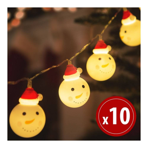 LED fényfüzér - hóember - 10 LED - 1,1 méter - melegfehér - 3 x AA Vidám, hóemberes fényfüzér, amely azonnal jókedvre deríti a családot. Az átlátszó kis hóember fejeket melegfehér LED-ek világítják meg, így otthonában minden irányból csodálatos vizuáli