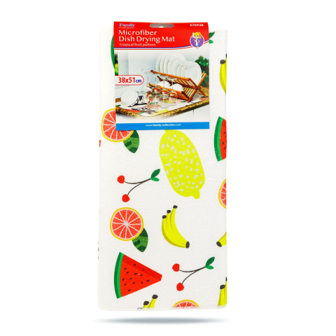 Mikroszálas Edényszárító Alátét - 38 X 51 Cm - Déligyümölcs Mintás GLO-57093B. Színe: Színes Praktikus, mikroszálas edényszárító alátét. A kézi mosogatás elengedhetetlen kelléke. Nagy a vízfelvevő képessége, mosógépben mosható. Mérete: 38 x 51 cm Anyaga: 100% poliészter Szín: Fehér Minta: Déligyümölcs mintás (banán, dinnye, grépfrút) GLO-57093B