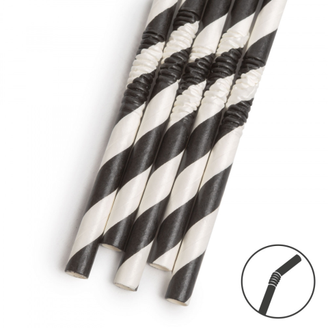 Papír szívószál - fekete csíkos 230 x 6 mm - 150 db / csomag Bármilyen ital fogyasztására alkalmas papír szívószál. Egyszer használatos, nem mosható. Hajlítható Fekete csíkos Papír anyagból Hossz: 230 mm Átmérő: 6 mm Szín: Fe