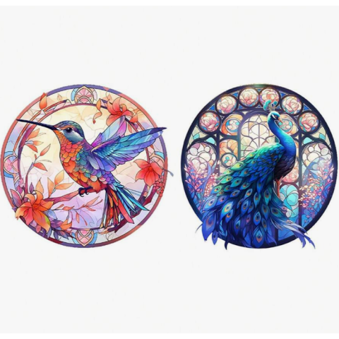 Színpompás pávát és kolibrit rózsaablakban ábrázoló falmatrica, ablakmatrica, mely varázslatos hangulatot teremt az otthonodban.