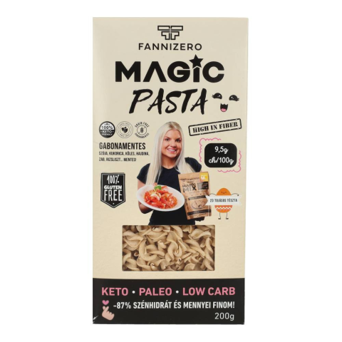 Gluténmentes, gabonamentes, 87%-kal csökkentett szénhidráttartalmú 23 tojásos száraztészta Magic Pasta ORSÓ Összetevők: FANNIZERO Magic Mix (bambuszrostliszt, útifű maghéj liszt), teljes tojáslé, tápióka keményítő! Nyomokban dióféléket tartalmazhat!