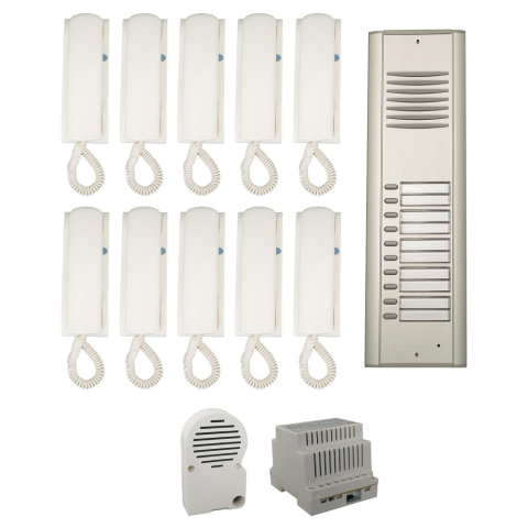 FARFISA Kaputelefon szett,10 lakásos, auidós, 4+1 vezetékes, Project-ErreP/R széria, süllyesztett kültérivel, 10xPT524SW, RP10+MD30, PRS220 egységekbőlEnglish: