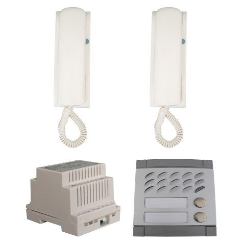 FARFISA Kaputelefon szett, 2 lakásos, audiós, 4+1 vezetékes, Project-Mody széria integrált hang egységgel, süllyesztett kültérivel, 2xPT510W, MD71+MD200, PRS210 egységekbőlEnglish: