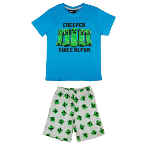 Képzelj el egy kényelmes, hűvös nyári estét, ahol a kis Minecraft rajongód már alig várja, hogy belebújhasson ebbe a két részes, szuper puha pizsamába! A kék színű rövid ujjú póló és a gumis rövidnadrág garantálja a kényelmet és a szabad mozgást, miközben