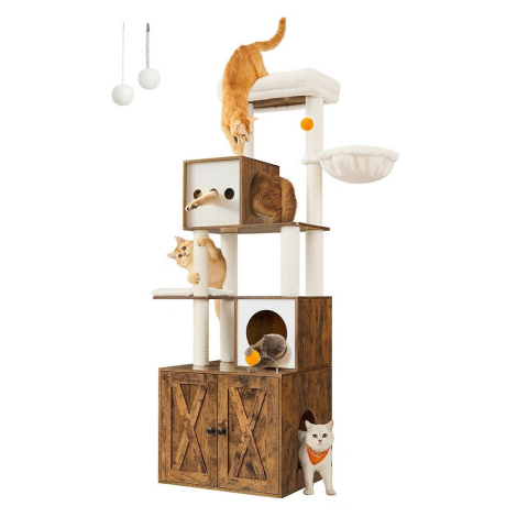 1 kép Feandrea Macska kaparófa, cicaházzal és alomtálca tartóval, rusztikus barna 60X52X183cm