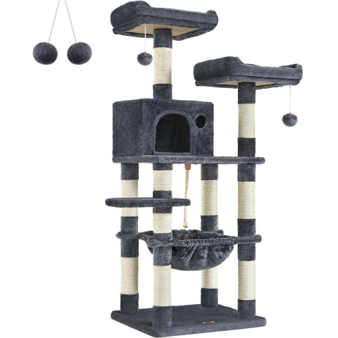1 kép Feandrea Macska kaparófa, cicaházzal, plüss pihenőhelyekkel, sötétszürke 140x61x51cm