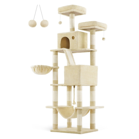 1 kép Feandrea Macska kaparófa, többszintes, pihenőkosárral, bézs 60x50x206cm