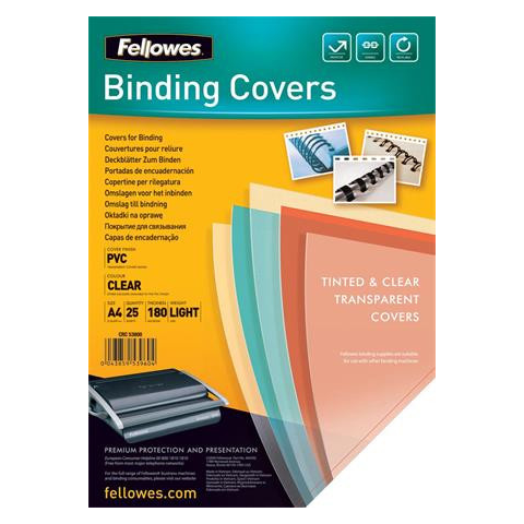 Előlap, A4, 180 mikron, FELLOWES, víztiszta, 25 db 180 mikron vastagságú, fényes, víztiszta előlap spirálozáshoz Méret: A4 Csomagolás: 25 db/csomag Egyaránt alkalmas fém és műanyag spirálokhoz Gyártó/első EU forgalmazó elérhetősége: Fellowes Holdings