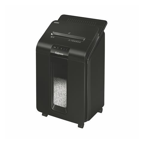 Iratmegsemmisítő, minikonfetti, 90 lap, FELLOWES AutoMax™ 100M Automata iratmegsemmisítő személyi használatra, 1 felhasználó számára. -biztonsági szint (papír): DIN P-4 -biztonsági szint (bankkártya): DIN T-4 -vágás típusa: papír-minikonfetti (4x10 mm