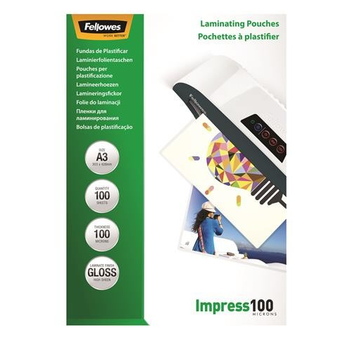 Meleglamináló fólia, 100 mikron, A3, fényes, 100 db, FELLOWES - Méret: A3 - Vastagság: 100 mikron - Felület: fényes - Védelem szintje: mindennapi - Alkalmazható pl. értesítések, fényképek laminálására, továbbá hobbi és kézművesség területen - Kiszerelé