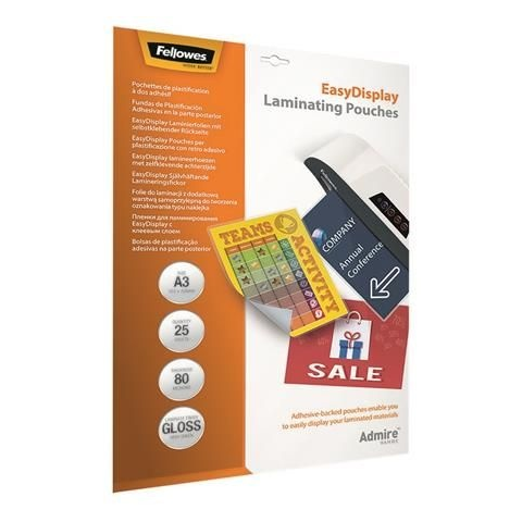 1 kép FELLOWES Meleglamináló fólia, 80 mikron, A3, fényes, öntapadó, 25 db, "Admire Easy Display"