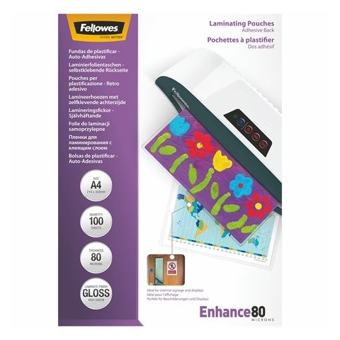 1 kép FELLOWES Meleglamináló fólia, 80 mikron, A4, fényes, öntapadó, 100 db, FELLOWES