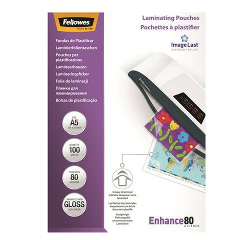 2 kép FELLOWES Meleglamináló fólia, 80 mikron, A5, fényes, 100 db, FELLOWES (IFW53060)