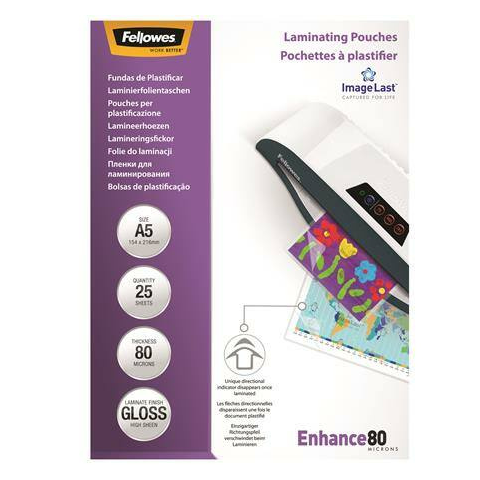 Meleglamináló fólia, 80 mikron, A5, fényes, 25 db, FELLOWES (IFW53960) - Méret: A5 - Vastagság: 80 mikron - Felület: fényes - Védelem szintje: alap - Alkalmazható pl. értesítések, fényképek laminálására - Kiszerelés: 25 db/csomag - A tökéletes végere