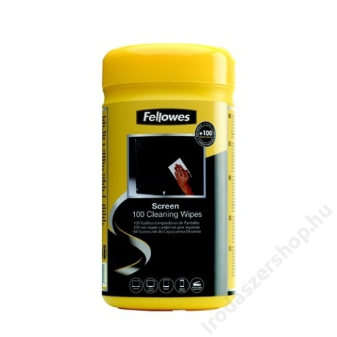 Tisztítókendő, képernyőhöz, 100 db, FELLOWES (IFW99703) - 100 db tisztítószerrel előre átitatott, biológiailag lebomló törlőkendő, újrahasznosítható dobozban - Alkalmazható bármely szkenner üveg felületének, PDA-nak, képernyő szűrőnek, CRT, vagy TFT/