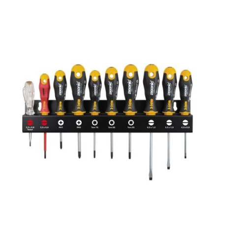 FELO Ergonic csavarhúzó készlet, műhelyben alkalmazható fém faliartóval. Tartalma: 3 db lapos, 2 db PH, 3 db Torx, 1 db lapos szigetelt, 1 db fázisceruza csavarhúzó