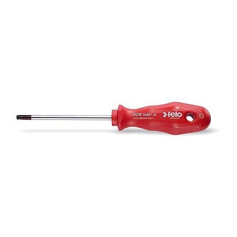 FELO Torx csavarhúzó, különösen nagy igénybevételre tervezett, egy komponensű markolattal. A markolatban található furat segítségével könnyen tárolható a szerszám és egy másik FELO csavarhúzó segítségével extra nyomaték érhető el. Méretei: T30, penge