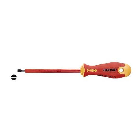 FELO lapos szigetelt csavarhúzó hornyos csavarokhoz, ERGONIC markolattal. Az egyetlen markolat, melynek a belsejében lévő zselés cella alkalmazkodik a felhasználó tenyeréhez, a maximális nyomaték kifejtése mellett, egyedülállóan kényelmessé teszi a mu