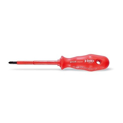 FELO PZ szigetelt csavarhúzó. A markolatban található furat segítségével könnyen tárolható a szerszám és egy másik FELO csavarhúzó segítségével extra nyomaték érhető el. A csavarhúzó 1000 voltig használható. Minden darab 10.000 volttal tesztelt, megfe