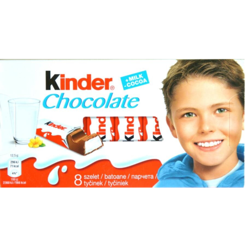 Kinder Chocolate, 8 szelet, egyenként csomagolt tejes töltésű finom tejcsokoládé. Kakaószárazanyagtartalom a tejcsokoládéban legalább 33%.