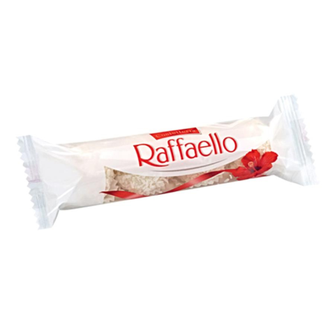 Raffaello: tejszínes krémmel töltött kókuszos golyó, mandulával a közepén, ropogós ostyába burkolva.