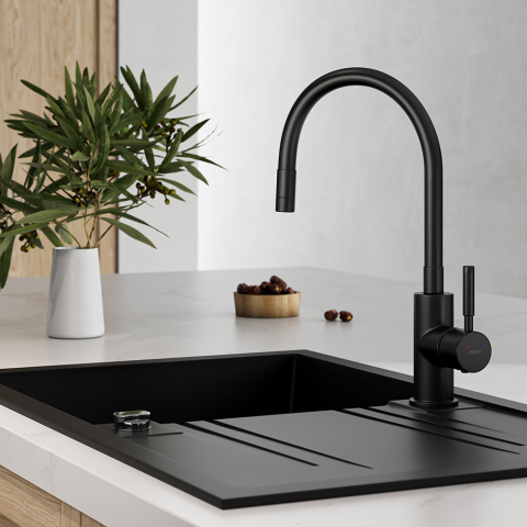 Jellemzők: - a csaptelep minden látható része fekete - kerámia szabályozó betét - flexibilis kifolyócső - a kifolyócső alakja szabadon változtatható - a kifolyócső hossza 130 mm - 390 mm között állítható - a kifolyócső magassága 230 mm - 456 mm