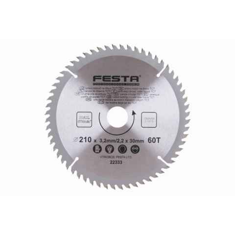 FESTA Fűrésztárcsa fához 210 x 30 x 2,2 mm / 60T Kiváló minőségű szénacél test (HRC: 40), váltakozó kialakítású wolfram-karbid fogak (HRA: 90), a penge túlmelegedését és deformációját megelőző belső hornyokkal. Technikai adatok Méret (mm) 210x30x3,2x