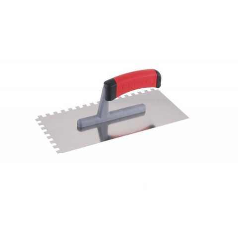 A termék leírása: Rozsdamentes acél simító Festa 280x130 mm, e8 fog, gumifogantyúval, lapvastagság 0,8 mm. Főleg ragasztók és burkolólapok, valamint esztrichek, stukkók, vakolatok, tömítőanyagok és egyéb építőanyagok felhordására használják. A rozsdamente