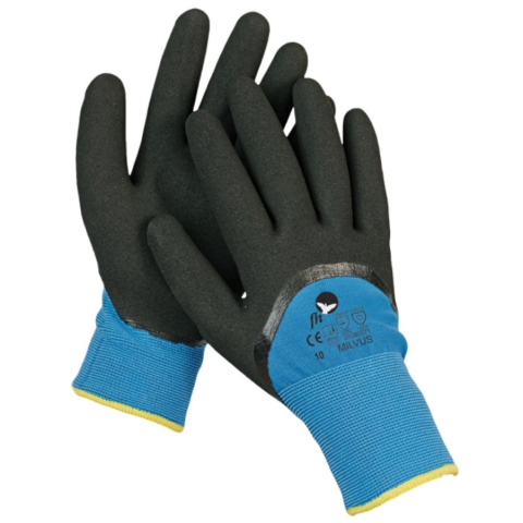 MILVUS kesztyű PES/nitril 3/4 - 10 • bélelt, kötött védőkesztyű, PE külső réteg, puha akril belső réteg • fekete nitrillel 2x mártott, homokszórt felület