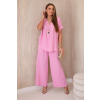 A blúzból és nadrágból álló, kétrészes olasz szett egy elegáns szett, amely varázst és stílust kölcsönöz minden stílusnak. A kiszélesedő blúz finom nőiességet kölcsönöz, kiemeli az alakot és egyben biztosítja a mozgás szabadságát. A nadrág klasszikus szabásának köszönhetően tökéletesen passzol egy elegáns blúzhoz, így teljes és stílusos összeállítást alkot. Ezenkívül a medál egy elbűvölő részlet, amely eredetiséget és karaktert kölcsönöz