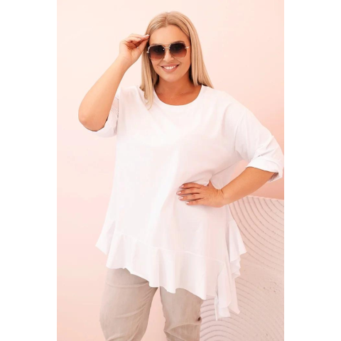Ez a női plus size pamut blúz egy különleges modell, amely ötvözi a kényelmet a divatos, nőies akcentussal. Puha és rugalmas pamut kötött anyagból készült, egész napos kényelmet biztosít viselés közben. A laza szabás nem simul a testhez, és a dekoratív fodor az alsó részen könnyedséget és karaktert ad a blúznak.