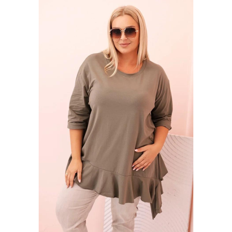 Ez a női plus size pamut blúz egy különleges modell, amely ötvözi a kényelmet a divatos, nőies akcentussal. Puha és rugalmas pamut kötött anyagból készült, egész napos kényelmet biztosít viselés közben. A laza szabás nem simul a testhez, és a dekoratív fodor az alsó részen könnyedséget és karaktert ad a blúznak.