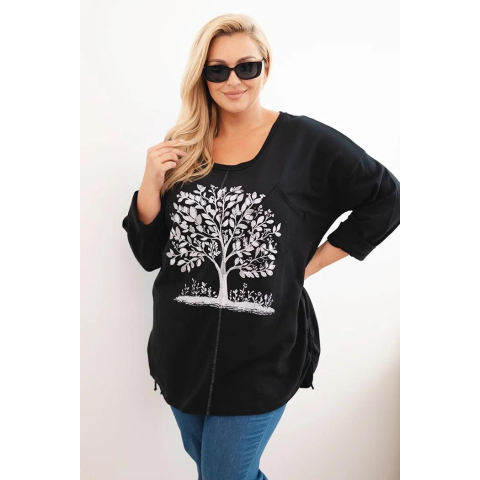 Női plus size blúz laza szabásban, ideális választás mindennapi viseletre azoknak a nőknek, akik értékelik a kényelmet és a stílust. A modell kiváló minőségű pamutból készült, elasztán hozzáadásával, ami garantálja a viselési kényelmet és a finom testhez igazodást. Az elülső részt egy hatásos fa minta díszíti, amely divatos jelleget kölcsönöz az egésznek.