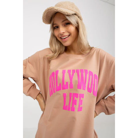 1 kép FiatalDivat Pulóver meghosszabbított hátrésszel, Hollywood Life bézs + rózsaszín felirattal