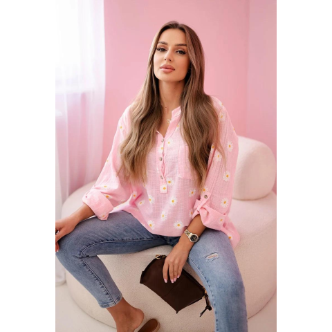 1 kép FiatalDivat Vászon blúz virágokkal, hosszú ujjú gombokkal, 22062-es modell, világos rózsaszín