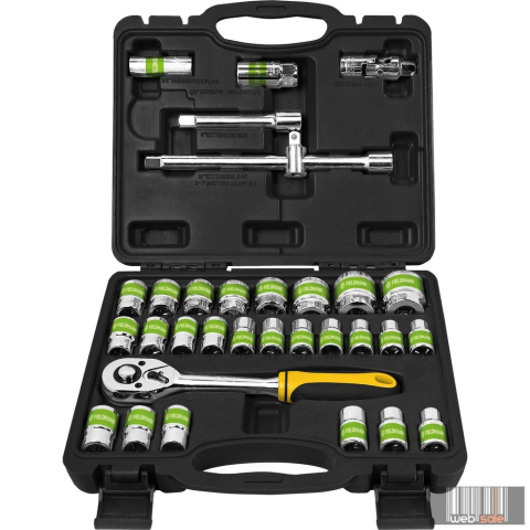Gola készlet harminckét részből, nagy, 1/2“ racsnival és dugókulcsfejekkel, valamint két típusú fejjel motorgyertyákhoz. Ez a készlet leginkább nagyobb terhelési igényű és kisebb munkaterületen végzendő munkákhoz alkalmas. A készlet nagyon erős Cr-V anyagból készült, amely csökkenti az elhasználódás mértékét.