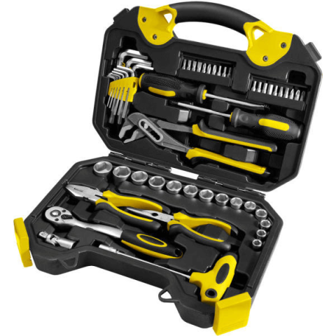 A készlet 54 részbõl áll - 3/8 racsnis kulccsal, 7 - 24 mm fejekkel, CR-V minõségben. A készlet tartalmaz továbbá diagonális és hosszabbító hajtószárat, valamint csõfogókat, de megtalálható benne imbuszkulcs és csavarhúzó készlet is. Az eszközök ergonomi
