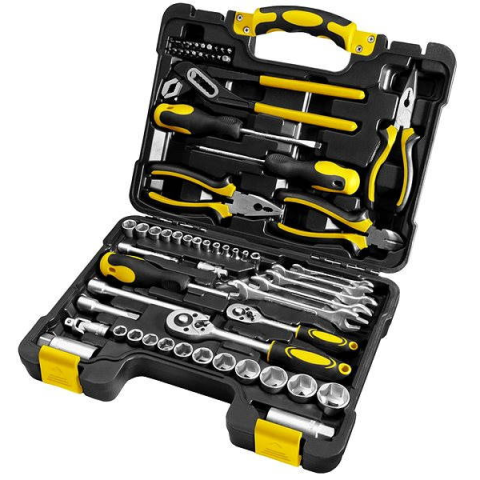 Szerszámkészlet - kéziszerszámok, CR-V anyagból, 65 db A szett 65 részből áll, 3/8"-os racsnis kulcsokkal, amely kiváló minőségű CR-V (króm-vanádium) anyagból készült, és amely magas szilárdságú, így sokkal kisebb a kopá