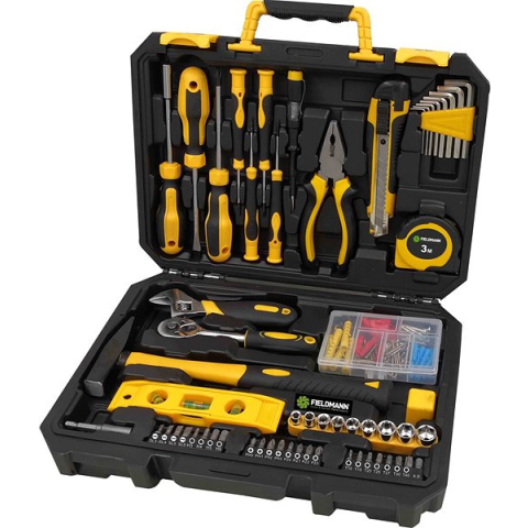 Szerszámkészlet - 138 db-os készlet, 1× 6" kombinált fogó, 2× csavarhúzó: SL6/100, PH6/100 mm, 1× dugókulcs hajtószár, 1× kés, 1× mérőszalag 3m, 8× dugókulcs: 5 - 13 mm, 1× racsnis 1/4", 1× 6" állítható kulcs, 8× imbuszkulcs, 1× 6" vízmérték, 1× csavarhúzó bitekkel: PH00, 0, SL2, 2.4, 24x 6/ 25 mm bit, 1× kalapács, 1× gumi kalapács adapter, 80× tipli, 1× feszültség teszter, 1× mágneses bittartó A FIELDMANN FDG 5013-138R minőségi szerszámkészlet kiv