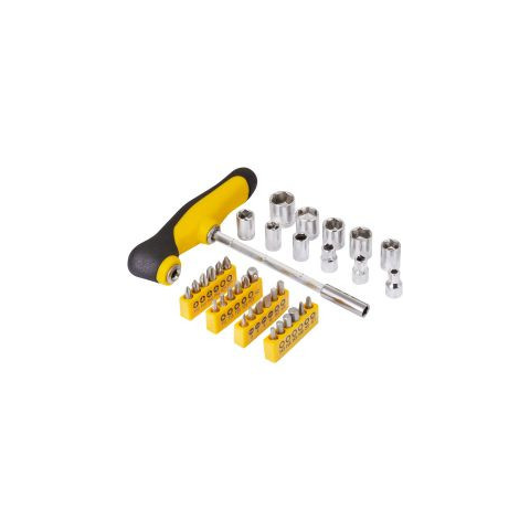 37 darabos bitkészlet, T kulcsal. Kompakt , könnyû, minden méretben.23bitfej segítségével könnyen boldogulhat bármilyen szerelési feladattal. bitfejek 23 darab 25 mm bit: H3,H4,H5,H6,T10,T15,T20,T25,SL3,SL4,SL5,SL6 PH0,PH1,PH2,PH3,PZ1,PZ2,PZ3,S0,S1,S2,S3 adapter dugókulcshoz 1db T alakú hajtószár 1db dukókulcsok 11 darab fej: 4,5,6,7,8,9,10,11,12,13,14 mm EAN 8590669283132
