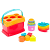 Játékdoboz tetővel és fogókával, 5 csónakot, 5 formát és 9 egymásra rakható csészét tartalmaz. A formák mind tárolhatók a dobozban.