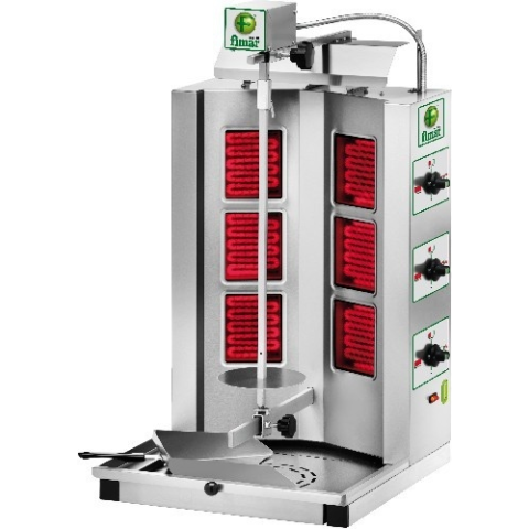 Rozsdamentes acél burkolat, nyárs és tálca, 3 szinten szabályozható 6 db üvegkerámia infra fűtőtest, állítható nyárstávolság, felső motoros meghajtás, opciós aktív szénszűrős ernyő és elektromos vágókés. Maximális nyárs átmérő: 470 mm Sütési magasság: 410/460 mm Kapacitás: 20-35 kg Teljesítmény: 4,2 kW/400V-3N~ Méret: 480x500x870 mm