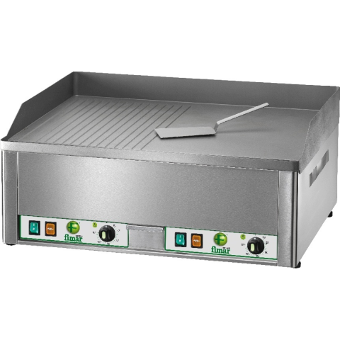 Sima/bordás kétzónás sütőfelület, termoszstatikus hőfokszabályzó, zsírfogó edény, 3 oldalon fröccsenés gátló, állítható lábakon. Teljesítmény: 6 (2x3) kW/400V-3N~. Mérete: 665x570x300 mm.