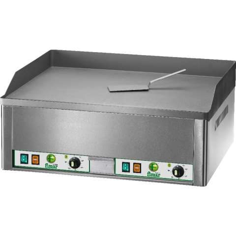 Sima kétzónás sütőfelület, termoszstatikus hőfokszabályzó, zsírfogó edény, 3 oldalon fröccsenés gátló, állítható lábakon. Teljesítmény: 6 (2x3) kW/400V-3N~. Mérete: 665x570x300 mm.