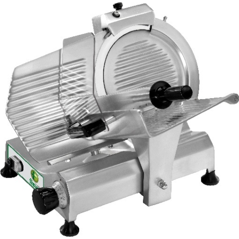 Eloxált alumínium test, rozsdamentes D=300 mm ármérőjű acél kés, gravitációs kivitel, manuális kocsi mozgatás, fokozatmentes szeletvastagság állítás (0-15 mm), levehető késélező. Maximális vágóméret: 220x200 mm Teljesítmény: 0,26 kW/230V-1N~ Mérete: 650x495x440 mm Származási hely Olaszország