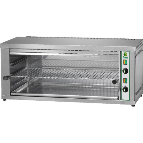 Állítható krómozott rácspolc, kivehető és tisztítható cseppfogó tálca, 3 teljesítmény szint. Rácsméret: 670x290 mm Munka magasság: 70-210 mm Teljesítmény: 3,2 kW/230V-1N~ Mérete: 880x370x400 mm